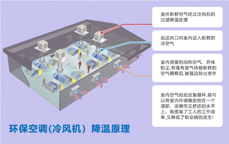 在空氣不流通的環(huán)境中,尤其是化工車間,容易產(chǎn)生建筑綜合癥,如悶熱、頭疼、眩暈、過敏、咳嗽等不適癥狀。使用環(huán)保空調(diào)(冷風機)通風降溫方案即可以有效降溫,又能保證空氣流通